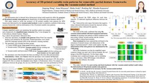 Accuracy of 3D-printed castable resin patterns for removable partial denture frameworks using the vacuum-sealed method, by Jingrong Wang, Anna Miyayasu, Maiko Iwaki, Roubing Ha, Manabu Kanazawa 1 Digital Dentistry, Graduate School of Medical and Dental Sciences, Tokyo Medical and Dental University 2 Advanced biomaterials, Graduate School of Medical and Dental Sciences, Tokyo Medical and Dental University